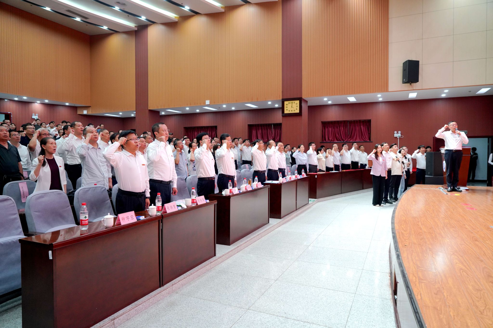 在教师宣誓仪式上,经济管理学院吴勋教授领誓,全体参会人员起立,庄严宣誓,表达了为党和人民的教育事业而努力奋斗的决心,彰显了教师职业的责任感与使命感。