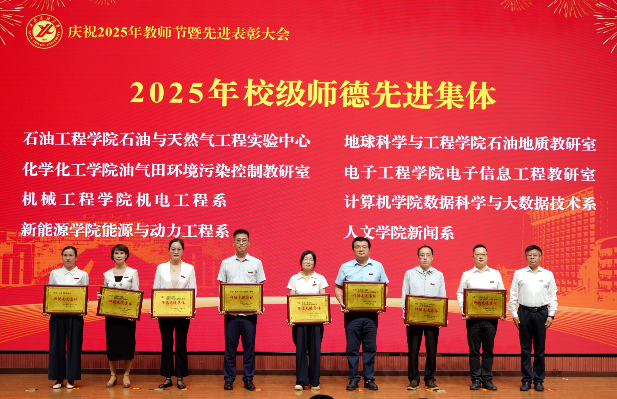 王进富指出,强国必先强教,强教必先强师;能源强国建设,更需强师支撑。学校坚持把师资队伍建设作为最重要的基础工作来抓。结合学校办学特色与育人使命,就把教书育人与服务国家能源安全战略紧密结合,如何做好“四有”好老师、当好“四个引路人”,他提出三点希望和要求:提高政治站位,以“三种精神”扛起“为党育人、为国育才”的光荣使命。要以延安精神铸魂,锚定能源教育的根本遵循;以石油精神破局,破解行业高校发展的关键课题;以铁人精神立心,彰显能源高校教师的特殊使命。加强队伍建设,以“四实一新”标准增强教师的职业荣誉感与归属感。要强师赋能铸魂,打造“能力强、有创新”的育人尖兵;要狠抓师德师风,造就“品德实、作风实”的引路之师;要弘扬行业美德,争做“基础实、善传承”的文明使者。弘扬教育家精神,为强国建设培育更多栋梁之才。要坚守爱岗敬业,以培养能源人才为最大荣光;要陶冶道德情操,做学生敬仰的“能源大先生”;要涵养仁爱之心,用大爱书写能源教育人生。