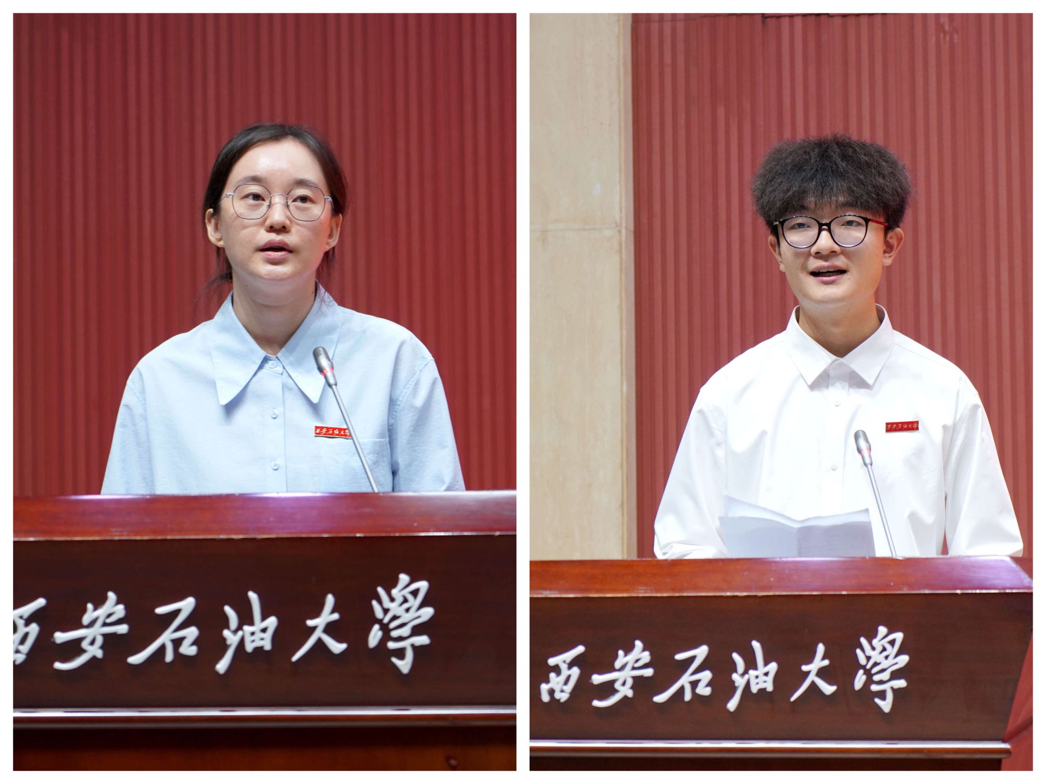 教师代表、陕西省青年拔尖人才、石油工程学院刘娅菲老师作交流发言,学生代表、地球科学与工程学院杜佳伟同学献词。