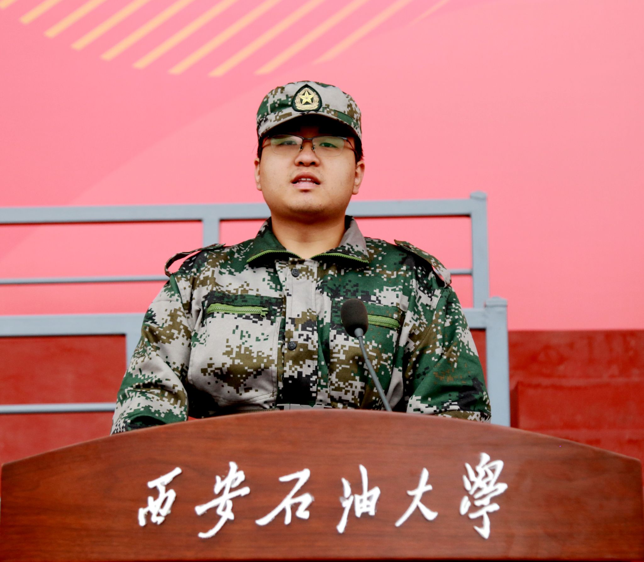军训学员代表、三营七连、化学化工学院雷昌华同学代表参训学生发言。他分享了自己主动捡拾场地垃圾,因而“捡”来了本次作为发言代表的机会,他号召全体同学在做好身边小事的同时,要不断发扬西石大人的朝气与力量。